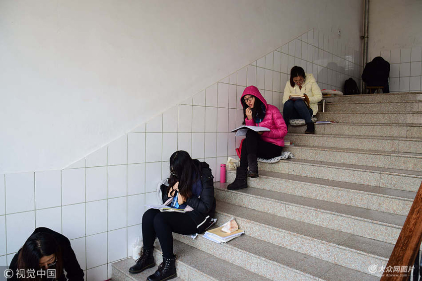 考研生在樓道內(nèi)背誦考試內(nèi)容。