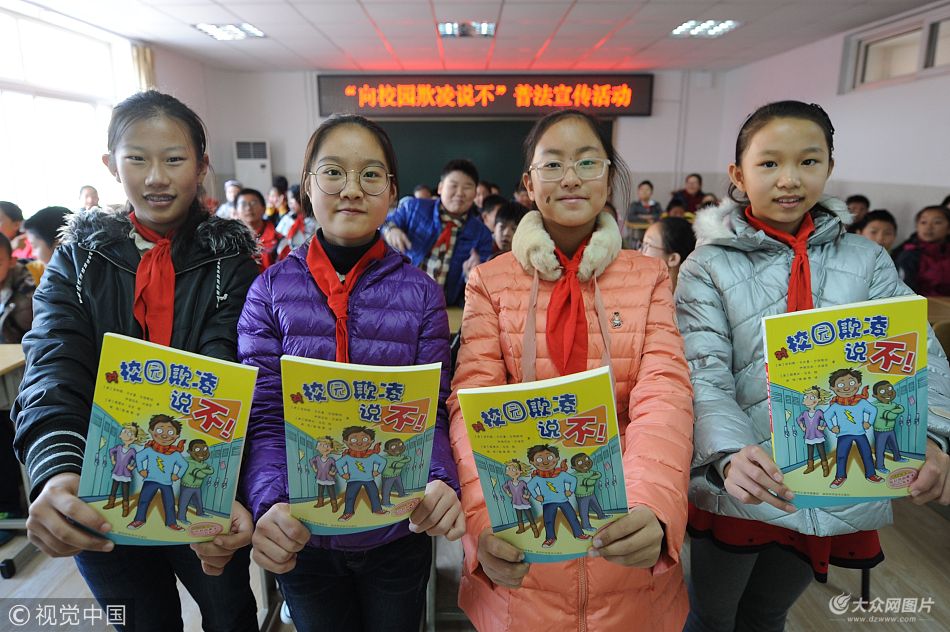 學(xué)生展示在普法課堂上領(lǐng)到的“向校園欺凌說不”書籍。