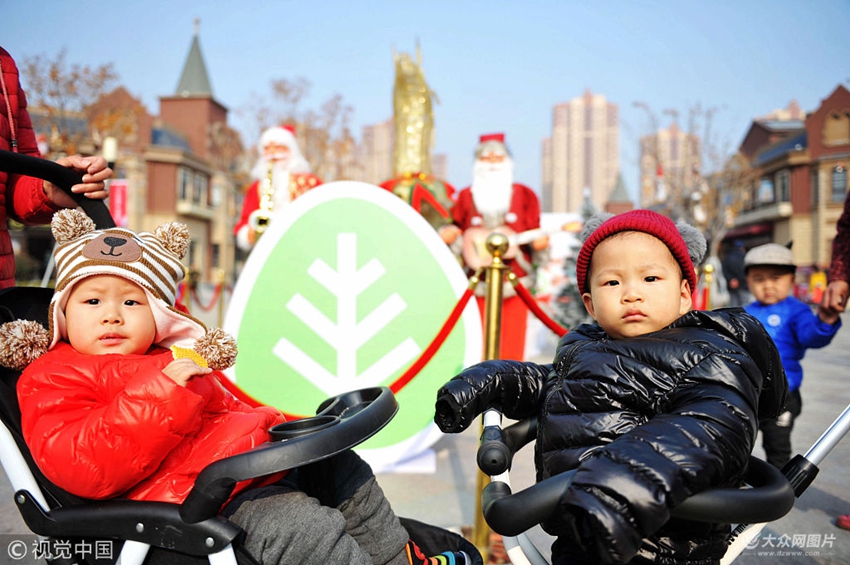 2017年11月28日,山東青島中德生態(tài)園福來(lái)社區(qū),兩位小朋友在圣誕老人前。