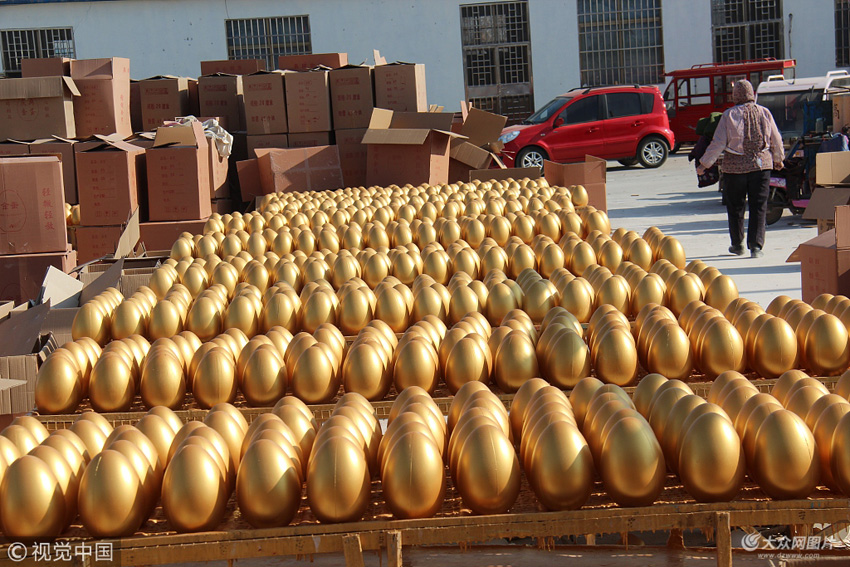 12月5日,臨沂,一走進(jìn)臨沂市費(fèi)縣水湖村就看到路邊擺滿了各式各樣的“金蛋”,這就是全國(guó)著名的中國(guó)水湖“金蛋”電商基地。這個(gè)村里有好多人以前做石膏手藝的。農(nóng)閑時(shí)蹲街串巷的制作銷售,趕上好的時(shí)候也能養(yǎng)家糊口。這一切銷售模式的改變還得從2000年以后說(shuō)起。自從李永主持的央視《非常6+1》的‘砸金蛋’節(jié)目開(kāi)始。全國(guó)各地的“金蛋”生意就火爆了起來(lái)。水湖村大部分百姓都開(kāi)始加入到這個(gè)行業(yè)中來(lái)。全村七百多戶,參與加工制作的達(dá)到了六百多。幾乎是全民皆兵。