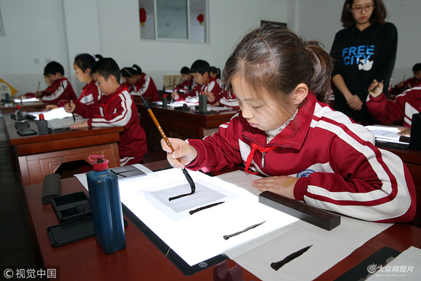 12月7日,東營東營市東營區(qū)英才小學(xué)的孩子們正在數(shù)字書法教室上書法課。近日,東營市首個數(shù)字書法教室在該校正式建成并投入使用。數(shù)字書法教室有48套交互式數(shù)字臨摹臺,引進(jìn)國內(nèi)最先進(jìn)的智云數(shù)字書法教學(xué)系統(tǒng)軟硬件設(shè)備,教師只需要在電子白板上進(jìn)行演示、講解,書法大家的書寫示范與教程動畫演示、書法老師的筆法等都可以通過學(xué)生端的交互式數(shù)字臨摹臺表現(xiàn)出來,實現(xiàn)了書法大師走進(jìn)課程“一對一”教學(xué)的效果;同時,學(xué)生還可以登錄自己的交互式數(shù)字臨摹臺進(jìn)行自學(xué)和練習(xí)。這種“一對一”、“手把手式”的教學(xué)激發(fā)了同學(xué)們的興趣,學(xué)生可以在交互式數(shù)字臨摹臺上臨摹感觸書法精髓,再通過傳統(tǒng)書法工具——筆墨紙硯進(jìn)行臨摹和練習(xí),既保留了傳統(tǒng)的筆墨紙硯的書法教學(xué)模式,又創(chuàng)新的引入數(shù)字化信息手段。