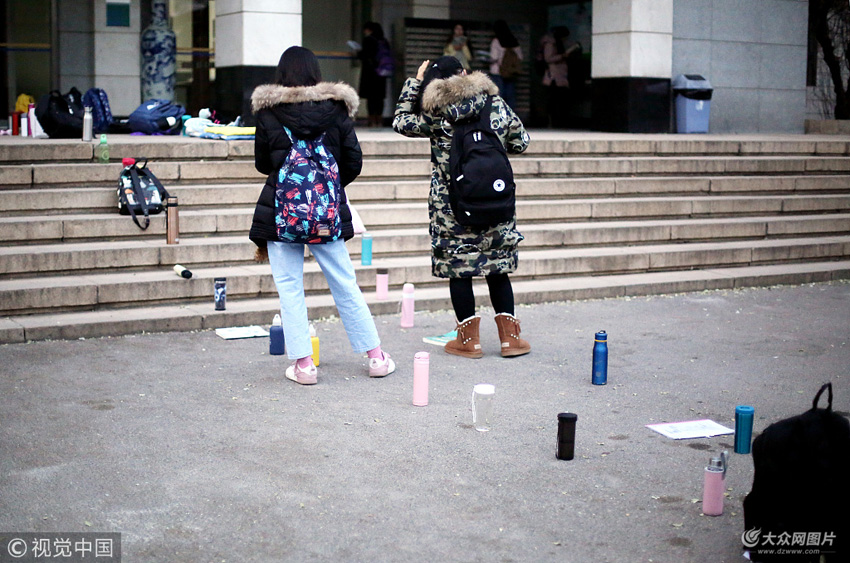 地面上的水杯、背包等物品排成兩行,場面相當(dāng)壯觀。