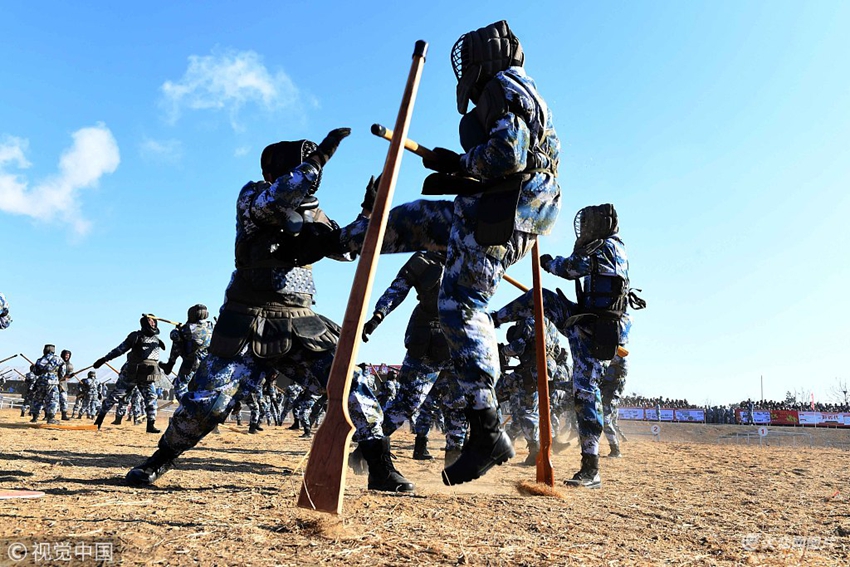 2017年12月8日上午,青島,北海艦隊(duì)某訓(xùn)練基地在實(shí)戰(zhàn)化訓(xùn)練場(chǎng)隆重舉行2017年新兵授銜儀式暨入伍訓(xùn)練結(jié)業(yè)典禮。器械搏擊訓(xùn)練。
