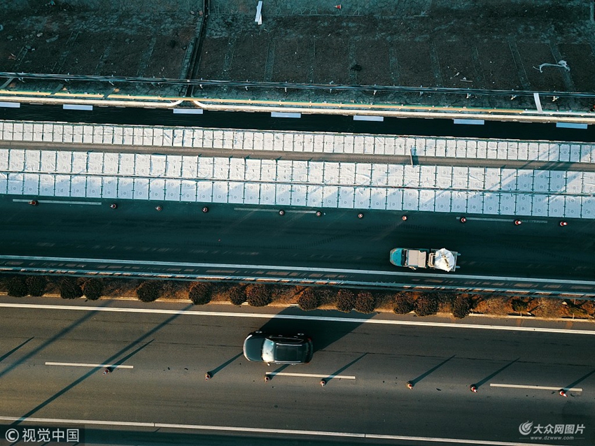 2017年12月13日,濟南繞城高速公路南段,施工人員正在鋪設(shè)光伏路面,地面上一個個白色方格下方就是太陽能電池。