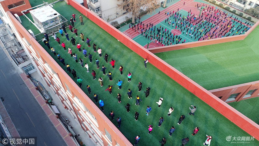2017年12月13日,山東省濟(jì)南市,在歷山東路北首的濟(jì)南解放路第二小學(xué),上午10點(diǎn)課間操期間,六年級3個(gè)班的學(xué)生來到教學(xué)樓五樓平臺(tái),在大約300平方米的樓頂操場做課間操,其他一至五年級的學(xué)生則在校園的操場和過道內(nèi)做操。