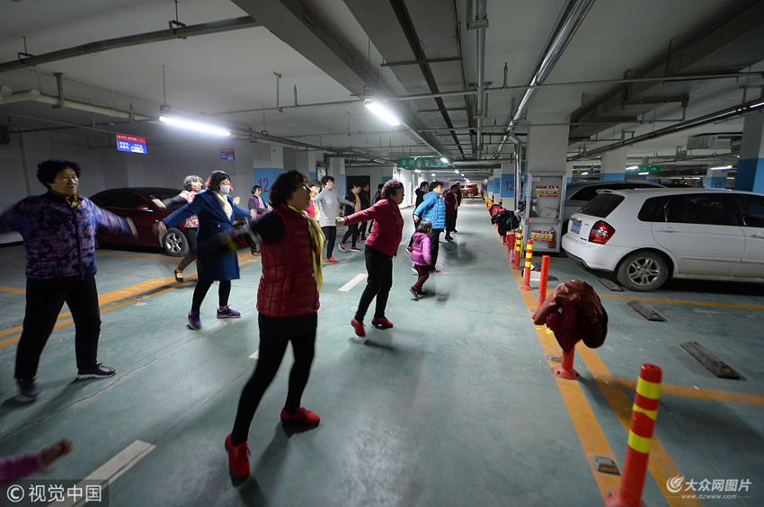 12月17日,濟(jì)南市,泉城已經(jīng)進(jìn)入寒冬模式,氣溫比較低,跳廣場舞的老人們便轉(zhuǎn)戰(zhàn)地下車庫。在齊州路一小區(qū)的地下二層車庫,30多位老人相約在車位之間的過道處,脫下厚厚的外套放在隔離樁上,伴隨著音樂跳起廣場舞。與室外-5℃的低溫相比,地下車庫沒有寒風(fēng),氣溫相對比較高一點(diǎn)。老人們攜帶的便攜式擴(kuò)音喇叭,雖然聲音較大,但不會影響樓上的居民。