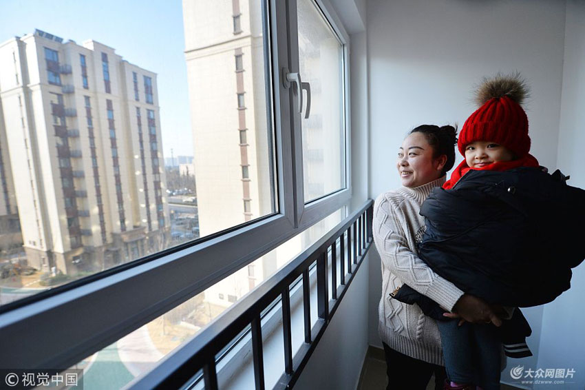 李滄區(qū)保利香雪山15號(hào)甲602戶(hù),租戶(hù)杜麗娜與孩子在領(lǐng)到公租房鑰匙后參觀新居。