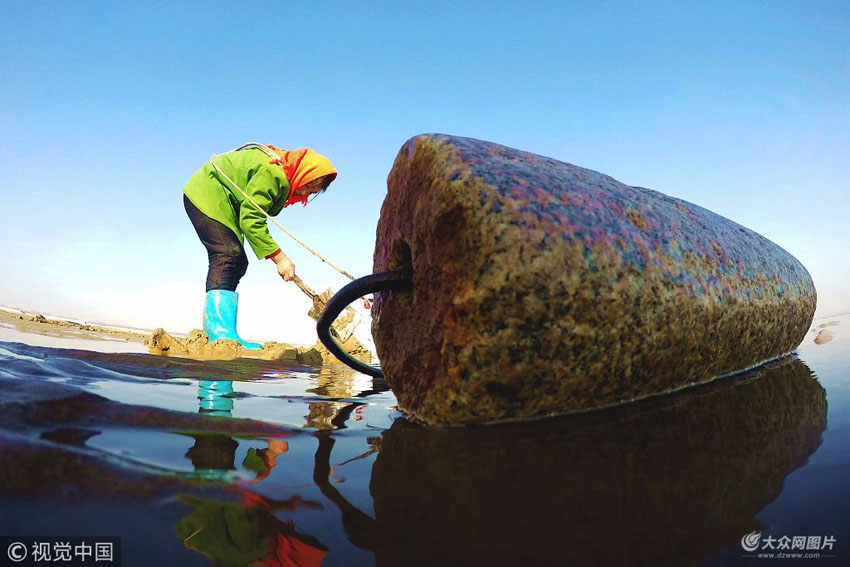 泊里鎮(zhèn)石崖村村民世代都生活在這里,每年立冬至次年農(nóng)歷2月,抓蟶王成為他們?cè)鍪蘸蛧L鮮的一種方式。如今,年輕人都進(jìn)城上班了,趕海挖蟶子最年輕的也是四五十歲的人了,最大的還有近七十歲的老人了。一個(gè)大潮水大約能有4個(gè)小時(shí)的時(shí)間碾壓和挖蟶王,運(yùn)氣好的話,一次能挖出十多斤,蟶王價(jià)格可與野生海參比肩,按100塊錢(qián)一斤的話,也能賣(mài)出千元左右,一個(gè)月至少有2次這樣的機(jī)會(huì),所以,挖蟶子也是村民冬季增收的一種好辦法。