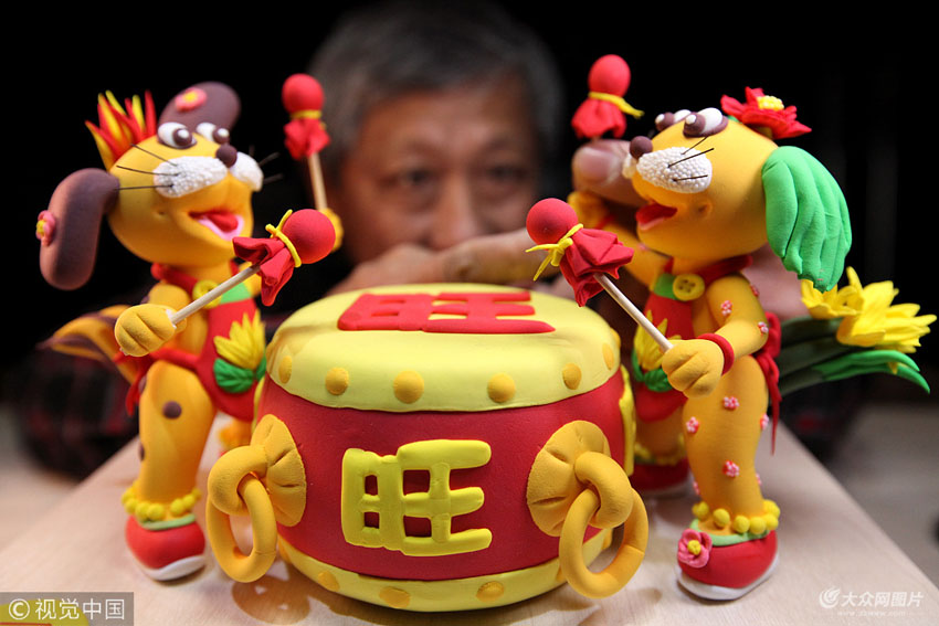 12月24日,闞宗勤在工作室創(chuàng)作生肖狗擂鼓迎新年面塑作品。