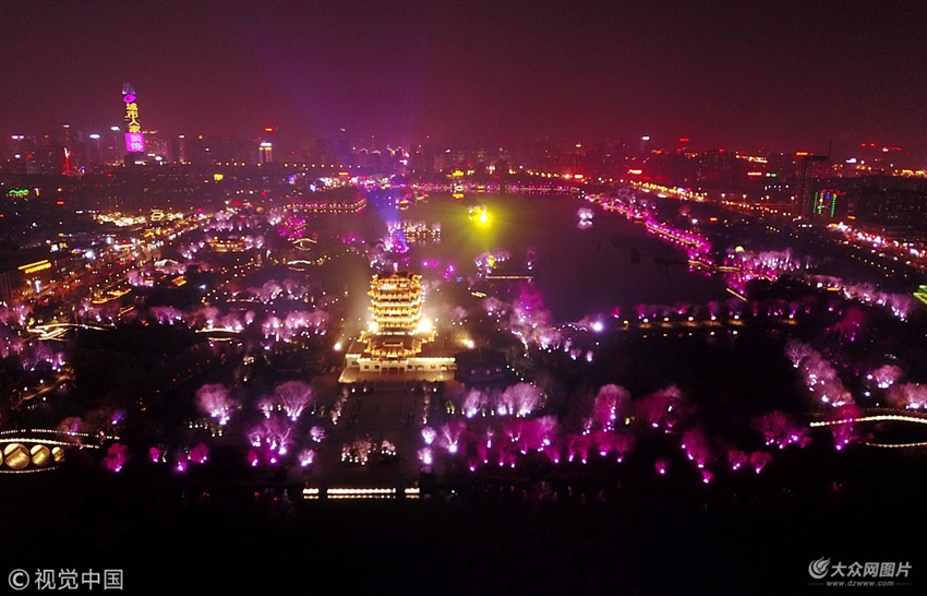 2017年12月27日晚6點(diǎn),濟(jì)南大明湖景區(qū),近日新安裝的千萬(wàn)盞彩燈首次全面亮燈調(diào)試。地面、樹木、水邊、建筑物上的彩燈全部點(diǎn)亮,激光也在空中畫出奇幻的圖案,整個(gè)大明湖景區(qū)猶如夢(mèng)境。