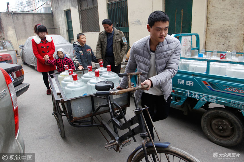 2017年12月29日,濟(jì)南,逯松濤用繩子牽著哥嫂一家去送水。