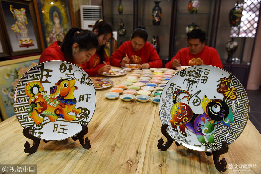 1月2日,臨沂,于文婷和員工一起制作景泰藍(lán)生肖狗看盤。