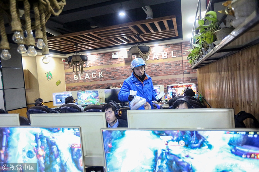 2018年1月1日,濟(jì)南,窯頭路上的一家網(wǎng)吧,一位玩家頭也不回地接過韓化龍手中的外賣。