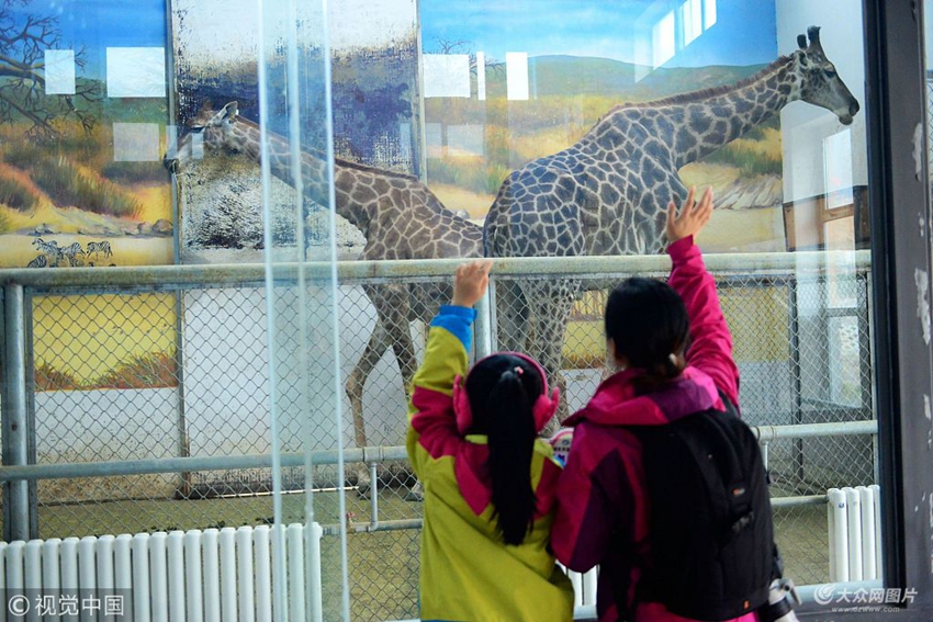 2018年1月7日,青島森林野生動(dòng)物世界, 游客在觀賞暖氣房中的長(zhǎng)頸鹿。
