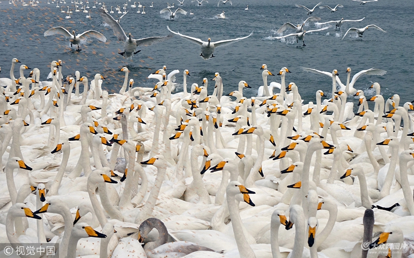 2018年1月8日,山東威海,大量天鵝在榮成煙墩角海域嬉戲。