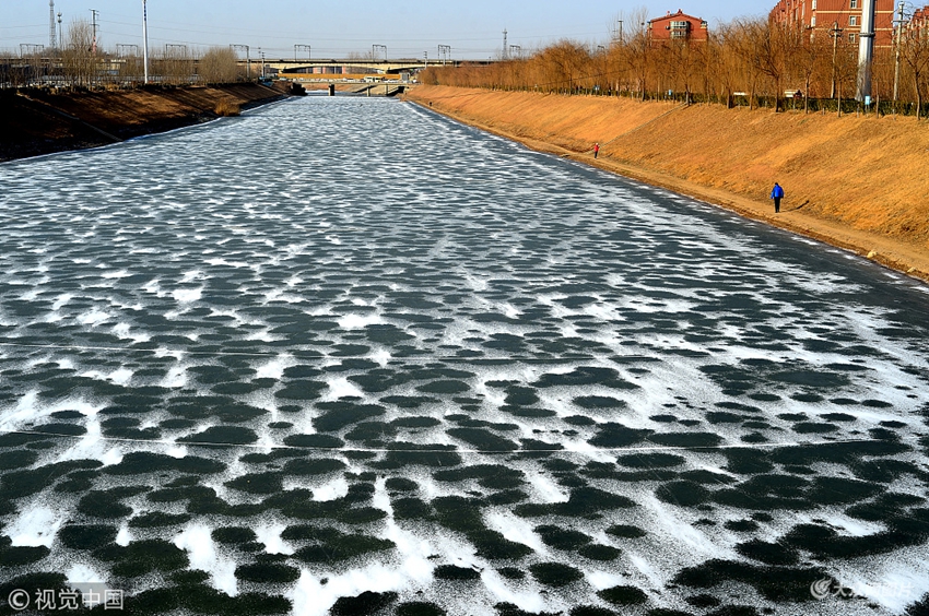 2018年1月8日,濟(jì)南,持續(xù)的寒冷天氣,讓臘山分洪道全部冰封,總長度達(dá)到3000米,前一日落在冰面上的雪花并未融化,在大風(fēng)的吹動下出現(xiàn)不規(guī)則的圖案,形成巨型冰雪畫。