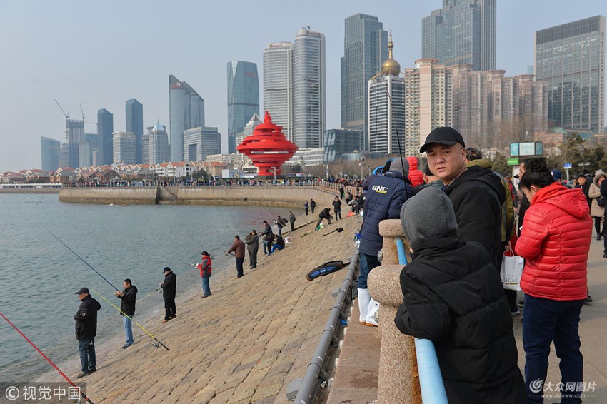 2018年2月21日,進入梭魚汛期,市民在青島市五四廣場拋竿垂釣吸引了眾多游客圍觀。