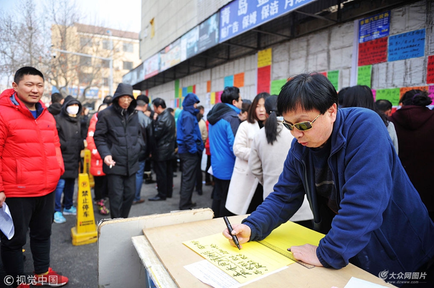 2018年2月22日,山東青島西海岸新區(qū)一外來人員務(wù)工市場,工作人員在給招聘單位書寫招聘信息。