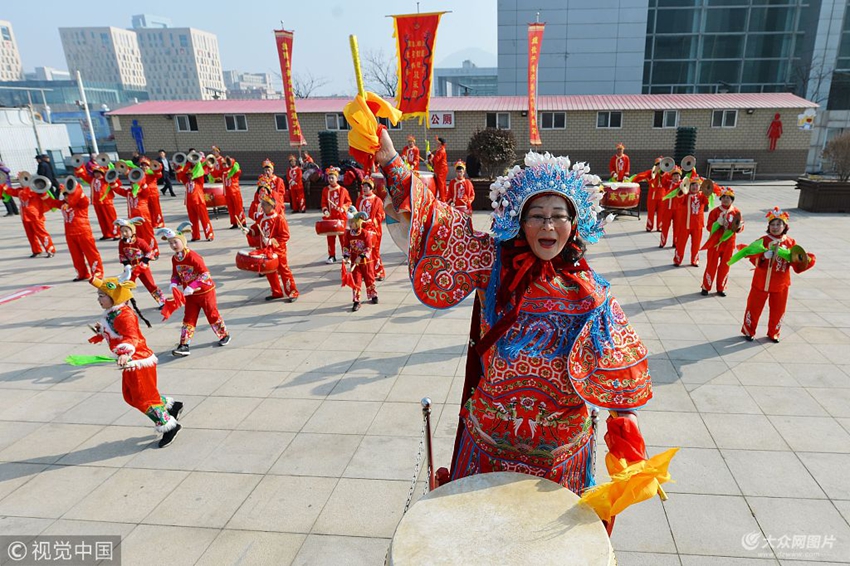 2018年2月23日,在青島市嶗山區(qū)世紀(jì)廣場,8只鑼鼓隊齊聲擂響,熱熱鬧鬧歡慶新春。