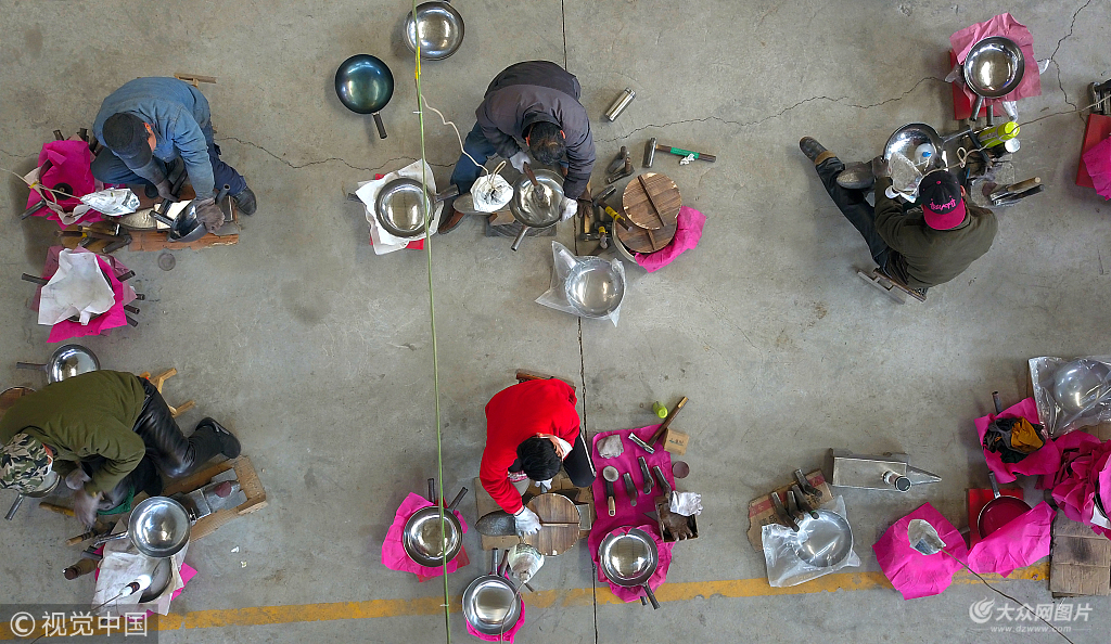 2018年1月30日,濟(jì)南,這里是馮全永的手工鐵鍋廠,26個(gè)鐵匠師傅各自頭頂白熾燈,戴著口罩和耳塞,手里的鐵錘用力錘打在一口鐵鍋之上。