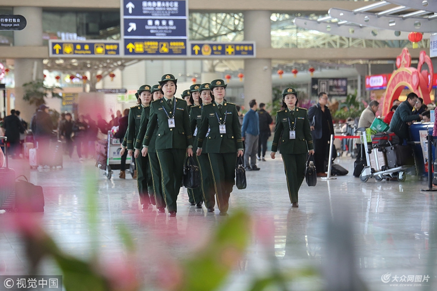 2018年3月5日,青島,在青島國(guó)際機(jī)場(chǎng),女子旅檢科民警列隊(duì)赴出境大廳執(zhí)行勤務(wù)。