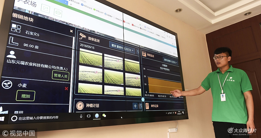 2018年5月15日,山東鄒平縣元瑞農(nóng)業(yè)科技公司工人查看元瑞智慧農(nóng)田監(jiān)測(cè)系統(tǒng)終端數(shù)據(jù),界面顯示的是公司農(nóng)田管理園石寶文管理的農(nóng)田環(huán)境情況。該系統(tǒng)可以監(jiān)測(cè)公司農(nóng)場(chǎng)的農(nóng)作物生長(zhǎng)溫濕度、氣壓、光照等十多項(xiàng)數(shù)據(jù),用于指導(dǎo)田間生產(chǎn)。