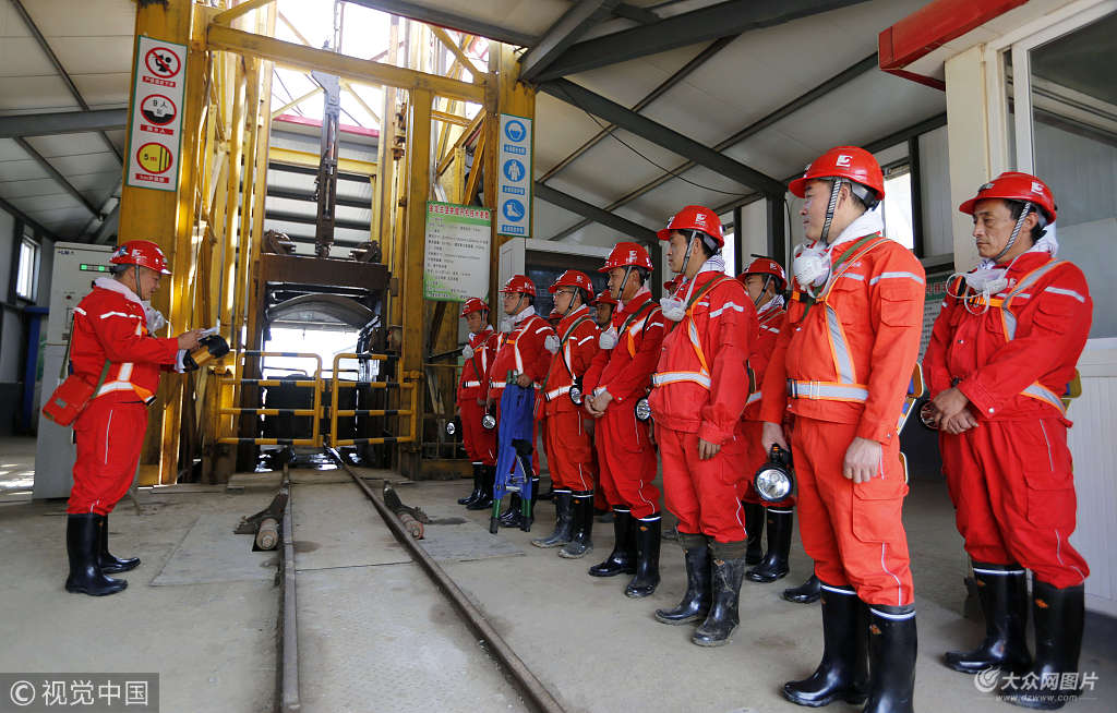 2018年6月12日,山東臨沂。在山東黃金集團(tuán)沂南金礦舉行的應(yīng)急救援演練中,救援人員在井口處集結(jié)完畢。圖片作者:王彥冰/視覺中國