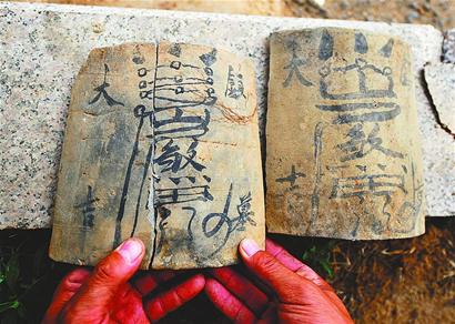從墓室中發(fā)現(xiàn)的寫有“鎮(zhèn)墓大吉”等字樣和圖案的瓦片。 (記者 崔健 攝)