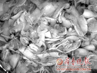片 來源:齊魯晚報[提要] 在濟南水產市場,一位從事水發(fā)貨生意多年的李先生算了一筆賬:一斤未發(fā)制的牛百葉市場價約21元,這些百葉加水,添入100克左右火堿,就能發(fā)制成5斤“水百葉”。“濟南市場上的水發(fā)貨,基本都進了大小飯店、火鍋店、燒烤攤……”濟南一家酒店負責采購的孫先生告訴記者。