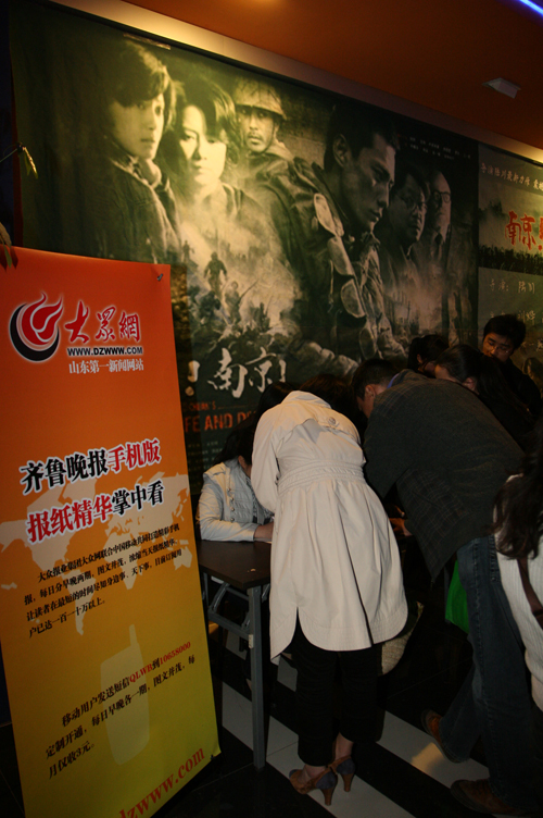 大眾網(wǎng)濟(jì)南4月22日訊(記者 劉寶才)大概沒(méi)有任何一種題材的電影,能像《南京!南京!》這樣的影片,牽動(dòng)著中國(guó)那根隱痛神經(jīng)!四年磨一劍,《南京!南京!》終于于2009年4月22日在全國(guó)公映。今晚7點(diǎn),齊魯晚報(bào)手機(jī)版—新世紀(jì)電影城觀影俱樂(lè)部的100名熱心讀者在濟(jì)南觀看了這部影片。