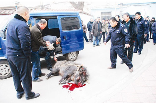 正當(dāng)人們準(zhǔn)備下手之際,這頭野豬再次發(fā)威,朝眼前的人們發(fā)動(dòng)了又一輪攻擊。人們被驚得四處躲避,野豬繞著醫(yī)院內(nèi)的通道瘋狂地飛奔起來(lái),由門(mén)診樓到花園,再由花園到停車(chē)場(chǎng),橫沖直撞。其間,醫(yī)院的上空又陸續(xù)傳來(lái)數(shù)聲槍響。最后,身中數(shù)槍、精疲力竭的野豬又一次躺在地上。