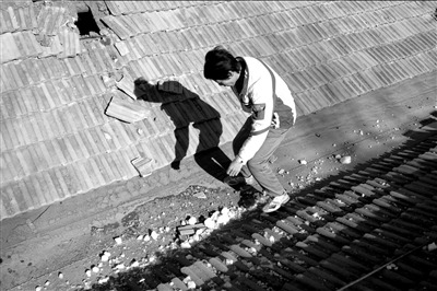昨天上午記者在現(xiàn)場看到,這間平房屋脊一側(cè)出現(xiàn)一個(gè)長約40厘米、寬約20厘米的窟窿,地上散落著一些水泥瓦片、木板碎片和冰塊,屋頂亦有部分冰塊尚未消融。