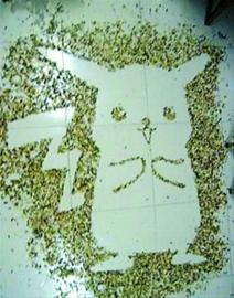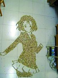 從幾幅畫中的地板相同、背景頗像學校宿舍來看,應在同一場所拍攝,作者或許是春節(jié)沒有回家的大學生?梢源_定的是,這位網友相當有才,想到將瓜子殼廢物利用起來。以地面為畫布,以瓜子殼做“沙”,經作者的一番妙手后,“輕音少女”、“海綿寶寶”、“皮卡丘”等卡通形象便躍然地上,成就了一幅幅特別的“沙畫”。不過,卡通形象繪畫并非這組繪畫的最出彩之作,令廣大網友大呼“寂寞”的乃是一幅“人影”瓜子畫。只見燈光下,一黑衣男子挺拔站立,在地面投下影子一片;而大量瓜子殼不多不少、邊緣清晰地填入了這片影子,還原出人影的形狀。黑衣人身與棕黃色瓜子殼人影相映襯,寂寞之感油然而生。