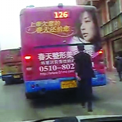 記者通過(guò)視頻看到,一名身穿黑衣黑褲的男子,扒在一輛行駛著的126路公交車的車尾,視頻放到第10秒鐘時(shí),公交車減速進(jìn)站,這時(shí),黑衣男子先放下左腳,試探著踏了下地,接著放下右腳,扒著公交車的后蓋小跑了幾米,隨即松手離開,直接鉆進(jìn)公交車站的人群中。整段視頻中,這名男子始終沒(méi)有出現(xiàn)正面影像。