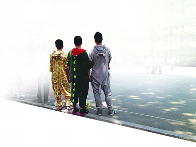 昨天中午,記者來到南京外國語學(xué)校太平北路校區(qū)。這個校區(qū)共有1000多名學(xué)生,包括初三年級以及高中部的IB國際課程預(yù)備班、中英劍橋班。正逢學(xué)生們中午休息時間,在一群校服中間,記者突然看到三個高個子男孩身著夸張造型的連體睡袍,一個是深綠色的恐龍裝,一個是橘黃色長頸鹿裝,還有一個穿著卡通龍貓服。他們走向旁邊的籃球場,并若無其事地站在場邊認真地看起比賽。而他們本身卻成了其他同學(xué)眼中的“風(fēng)景”,贏來路上很多同學(xué)的注目禮,回頭率不是一般的高。