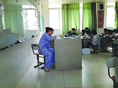 離開教室,記者又走進了教師辦公室。正值上課時間,辦公室里只有兩位老師,一位中國老師上身穿著睡衣,另一位外教是睡褲、拖鞋打扮。更讓記者吃驚的是,記者在老師辦公室外還看到一名教工,他也是身著睡衣。