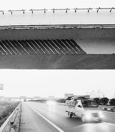 12月4日,記者與相關(guān)專家沿劉江立交橋縱橫兩個方向進行了實地勘察,發(fā)現(xiàn)河南漯河市境內(nèi)的京港澳高速與寧洛高速立交橋、許昌市境內(nèi)的京港澳高速與蘭南高速立交橋、開封市境內(nèi)的連霍高速與大廣高速立交橋、通許縣境內(nèi)的大廣高速與蘭南高速立交橋、扶溝縣境內(nèi)的永登高速與大廣高速立交橋、周口市境內(nèi)的商周高速與大廣高速立交橋、寧洛高速與商周高速立交橋7座大橋,均無鋼板加固措施。