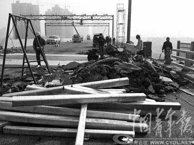 葉鐵橋 來源: 中國青年報[提要] 12月28日,記者在二七長江大橋上看到,一些地方的伸縮縫還在挖掘過程中,各種建筑材料到處堆積,工地上非常忙亂。12月中旬,這些質(zhì)疑甚至似乎獲得證實,因為有廣播電臺記者采訪到“武漢城投公司二七大橋總工”易江鴻,易的講話似乎證實“搶工期”的問題確實存在。