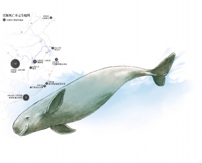 18時(shí)45分,又有漁民電話報(bào)警:太平咀有一頭雄性死亡江豚。這是當(dāng)天發(fā)現(xiàn)的第3頭死亡江豚。其中14時(shí)發(fā)現(xiàn)的雌江豚懷有一頭雄性小江豚。