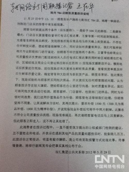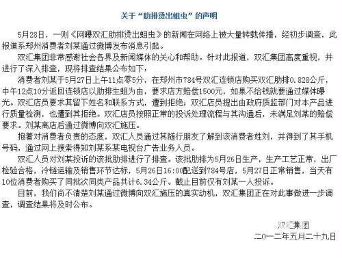 聲明稱:11月(本網(wǎng)注:應為5月)27日中午12:10一顧客到豐產(chǎn)路政七街雙匯784店,端著一鍋湯說:剛剛在門店買的排骨中有生蛆現(xiàn)象。店長接待時,顧客提出兩個條件:一是給予500元的賠償,二是媒體爆光(本網(wǎng)注:曝光)。店長請示后王督導趕到現(xiàn)場請示情況,顧客不聽仍堅持兩個條件,區(qū)域經(jīng)理及商業(yè)公司營運部應部長隨后趕到現(xiàn)場。四級負責人當場復核,查看相關單據(jù)和貨品,確定脊骨和大肋排為新到貨產(chǎn)品,鮮度非常好。現(xiàn)場試驗柜內(nèi)顧客所買同批次商品,開水燙后無任何顧客描述問題,認為顧客投訴存在較大嫌疑。雙匯先后提出顧客留樣,檢測部門送樣品給予適當補償?shù)冉鉀Q方法。而顧客再次提出;要求補償1500元(500元為商品補償,1000元為精神補償),并說現(xiàn)場現(xiàn)金補償后可將手中照片刪掉。