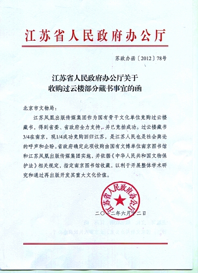 江蘇迅即應(yīng)對(duì),省人民政府辦公廳昨日緊急向北京市文物局發(fā)出《關(guān)于收購(gòu)過(guò)云樓部分藏書事宜的函》,函中寫道:江蘇鳳凰出版?zhèn)髅郊瘓F(tuán)作為國(guó)有骨干文化單位競(jìng)購(gòu)過(guò)云樓藏書,得到省委、省政府全力支持,并已競(jìng)拍成功。過(guò)云樓藏書3/4在南京,現(xiàn)1/4成功競(jìng)購(gòu)回歸江蘇,是江蘇人民也是社會(huì)輿論的呼聲和企盼。省政府確定此項(xiàng)收購(gòu)由國(guó)有文博單位南京圖書館和江蘇鳳凰出版?zhèn)髅郊瘓F(tuán)實(shí)施,并依據(jù)《中華人民共和國(guó)文物保護(hù)法》相關(guān)規(guī)定,指定南京圖書館收藏,以利于開(kāi)展整體學(xué)術(shù)研究和通過(guò)再出版開(kāi)發(fā)其重大文化價(jià)值。