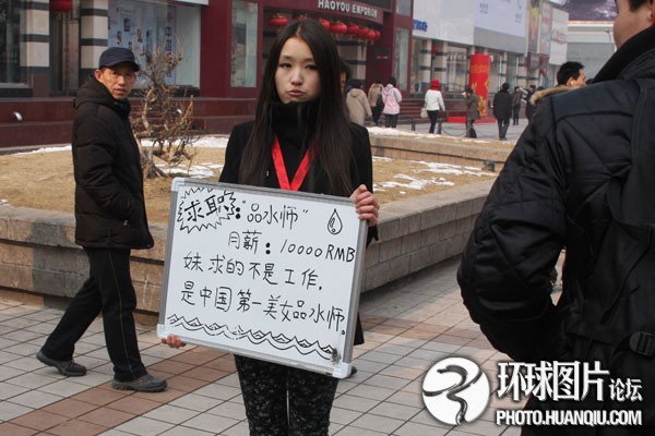 近日,一位求職女孩在王府井大街上舉牌找工作,牌上寫道:“求職:品水師,月薪:10000RMB,妹求的不是工作,是中國第一美女品水師!碑斅啡藛柕,為何用這種方式找工作?女孩說自己是在國外學習品水的知識,回國之后想找一份品水師的工作,可是一直沒有企業(yè)需要。萬般無奈之下,希望用這樣的方式來試一試,希望能引起關注幫她早日找到工作,也想讓大家對品水師這個新興職業(yè)多些了解。女孩當場還為路人介紹很多關于水的知識:意思就是說天然礦泉水才是最健康的飲用水,少喝純凈水,F場還有好幾個老外,也問了很多問題,女孩很耐心的解答。