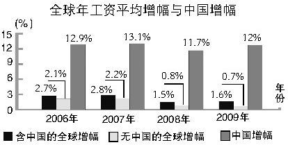 事實(shí)上,2008年全球工資增長1.5%,2009年1.6%的平均月工資增長速度還是中國帶動的。去除中國的增長數(shù)據(jù)拉動因素,兩個數(shù)字立即縮水到0.8%和0.7%,整體拉低半截。