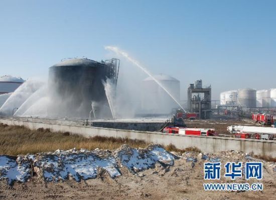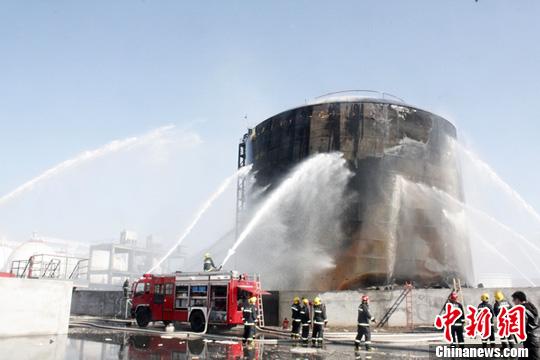 12月18日,明火熄滅后,救援人員繼續(xù)向儲罐噴水,防止復(fù)燃。新華社發(fā)(王洪戰(zhàn)攝)