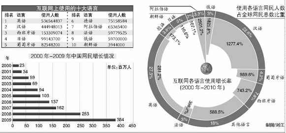數(shù)據(jù)顯示,21世紀(jì)前10年中,互聯(lián)網(wǎng)上使用漢語(yǔ)的人數(shù)增長(zhǎng)了1277.4%。去年,中國(guó)新增互聯(lián)網(wǎng)用戶3600萬人,這意味著其總用戶超過4.4億人,大約占總?cè)丝诘?2.6%。