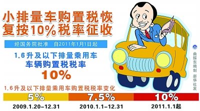 據(jù)新華社電 記者昨天從財政部獲悉,經(jīng)國務(wù)院批準(zhǔn),自2011年1月1日起,將對1.6升及以下排量乘用車統(tǒng)一按10%的稅率征收車輛購置稅。