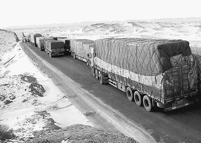 因降雪導致道路結冰,12月30日,甘肅省瓜州縣星星峽以西新疆境內國道312線大量車輛滯留。趙亮攝 (新華社發(fā))