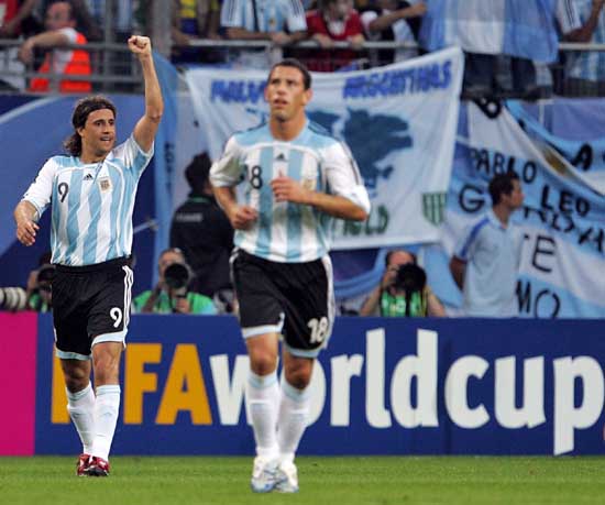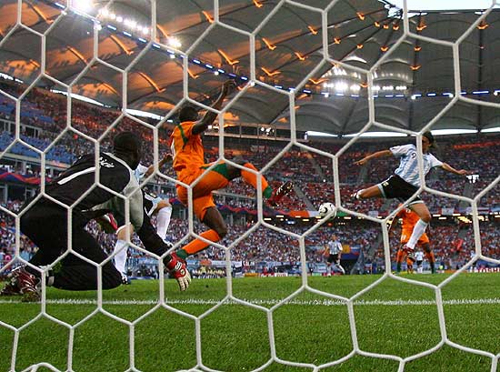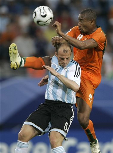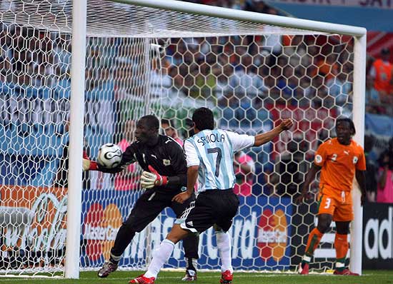 北京時間6月11日,第18屆世界杯足球賽C組結(jié)束首輪首場爭奪。在漢堡AOL競技場阿根廷隊?wèi){借著兩名前鋒克雷斯波和薩維奧拉的各一粒入球以2-1擊敗科特迪瓦取得開門紅,在近四屆世界杯首戰(zhàn)比賽中保持全勝戰(zhàn)績。第24分鐘,里克爾梅開出的任意球在科特迪瓦禁區(qū)內(nèi)引起混亂,克雷斯波后插上彈射打破僵局。第38分鐘,里克爾梅妙傳直塞打身后,薩維奧拉反越位成功后輕松擴大領(lǐng)先優(yōu)勢。第82分鐘,科特迪瓦“左右開弓”并由德羅巴在中路半轉(zhuǎn)身低射打入了科特迪瓦歷史上在世界杯決賽圈中的首粒進(jìn)球。
