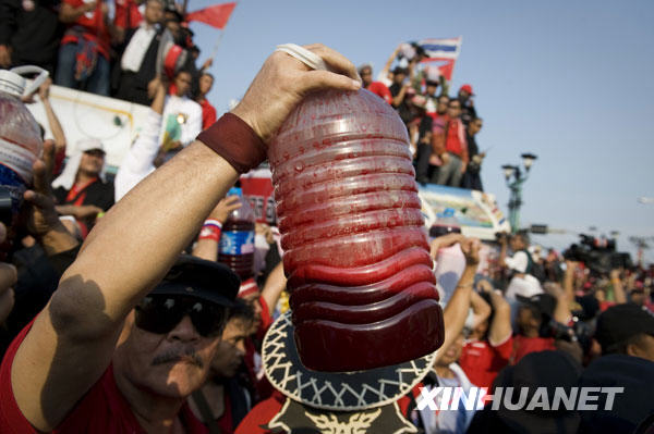 3月16日,在泰國(guó)首都曼谷,反政府組織“紅衫軍”成員準(zhǔn)備將血液潑灑在總理府門前。 支持泰國(guó)前總理他信的反政府組織“紅衫軍”當(dāng)?shù)貢r(shí)間當(dāng)天下午在總理府門前實(shí)施潑灑血液行動(dòng),以此向政府施壓,要求解散國(guó)會(huì)下議院。 新華社/法新