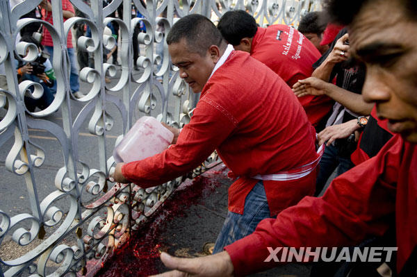 3月16日,在泰國(guó)首都曼谷,反政府組織“紅衫軍”成員將血液潑灑在總理府門前。新華社/法新